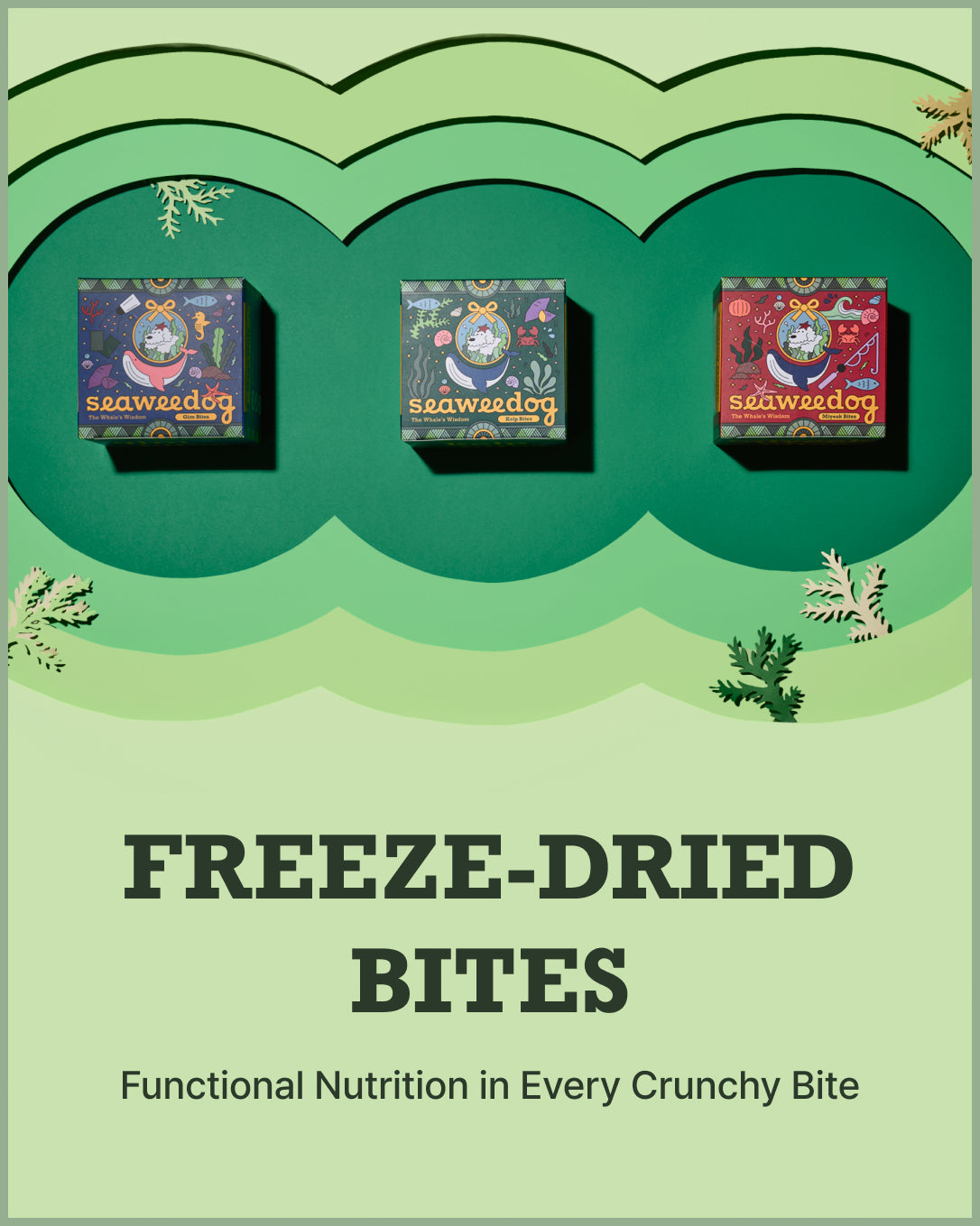 Seaweed absorbs 5x more CO₂ than land plants and requires no fresh water or fertilizers to grow. By choosing our seaweed-based treats, you are reducing your carbon footprint and supporting ocean ecosystem restoration.